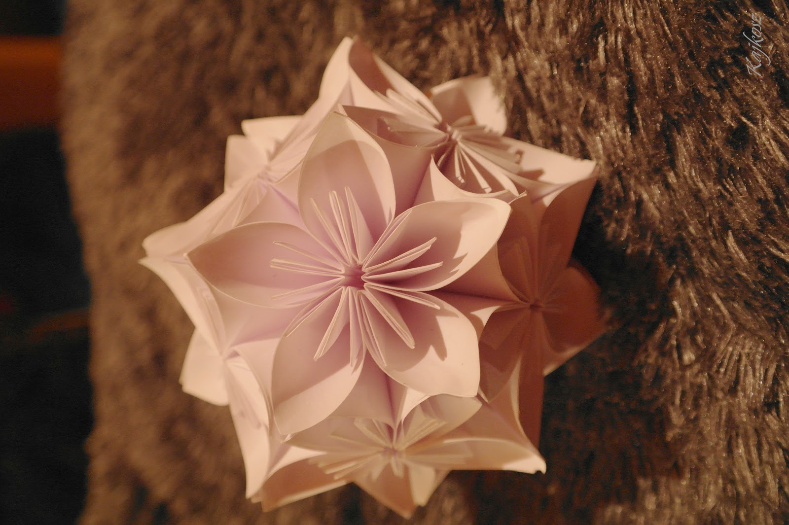 Elementy składa się dość szybko i przyjemnie, mimo, że pojedynczych "płatków" trzeba zrobić aż 60. Ja kupuję bloczek karteczek, więc nie muszę się męczyć z wycinaniem (a i tak by mi to nie wyszło). Problemy pojawiają się gdy trzeba skleić w całość gotowe "kwiatuszki", czyli 5 sklejonych "płatków". Tak, to nie jest takie prawdziwe origami, wiem, że tradycyjnie kleju się nie używa. I to jest pierwsza kusudama, którą udało mi się skleić w miarę równo i bez większych problemów. Ale tak się na tym skupiłam, że zapomniałam o zawieszce:)
